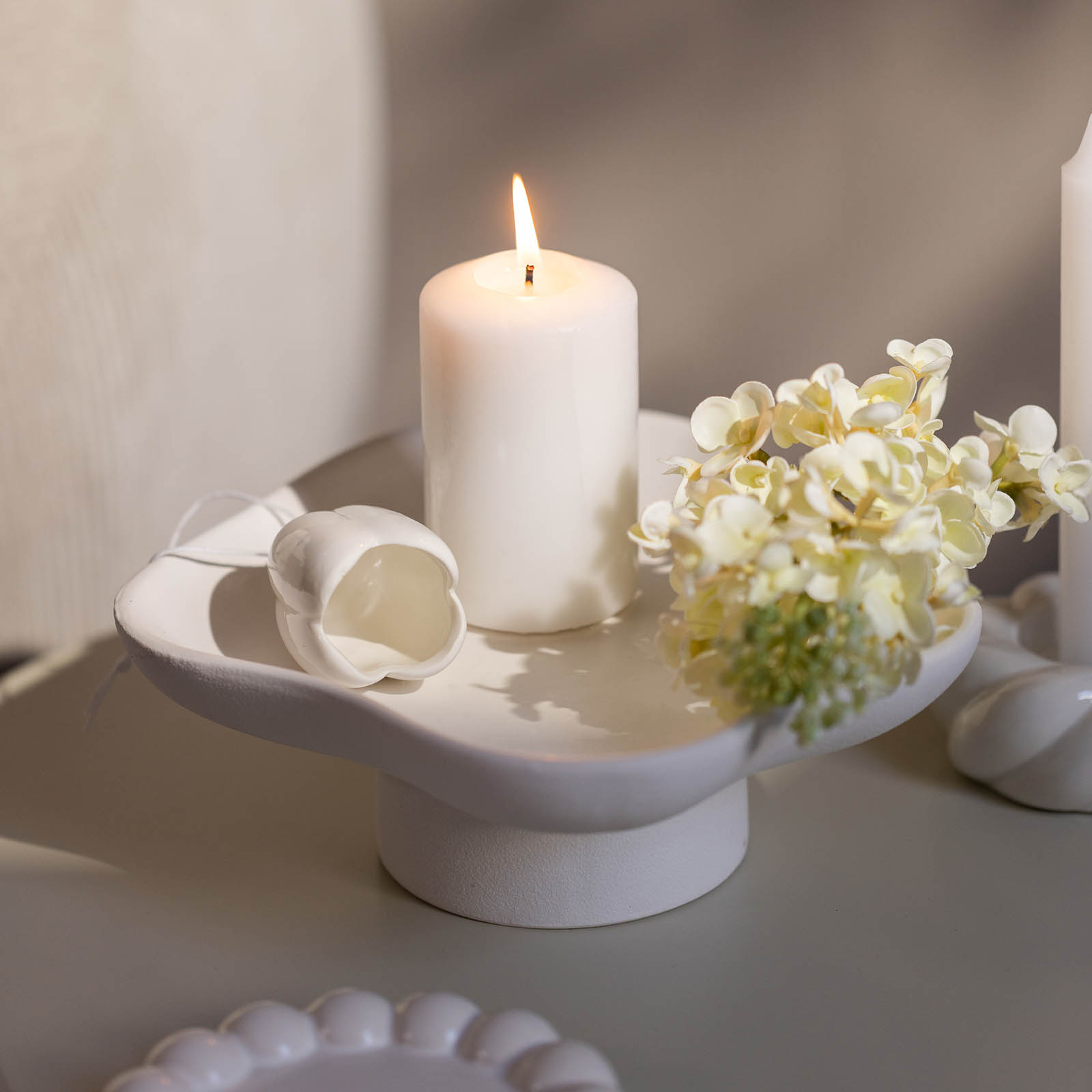 Ein stilvolles Ensemble in sanften Naturtönen: Auf dem erhöhten Dekotablett vereinen sich schlichte Stumpen- und Tafelkerzen mit einem kunstvoll geschwungenen Kerzenhalter. Der zarte Fliederzweig und ein filigraner Anhänger setzen dezente Highlights. Neben dem Tablett rundet der beige Kerzenteller das Arrangement harmonisch ab – eine zeitlose Dekoration mit sanfter Eleganz.